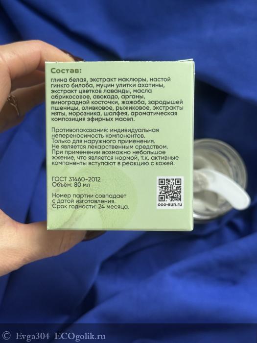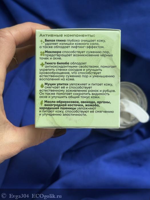 глина белая, экстракт маклюры, настой гинкго билоба, муцин улитки ахатины, экстракт цветков лаванды, масла абрикосовое, авокадо, арганы, виноградной косточки, жожоба, зародышей пшеницы, оливковое, рыжиковое, экстракты мяты, морозника, шалфея, ароматическая композиция эфирных масел.