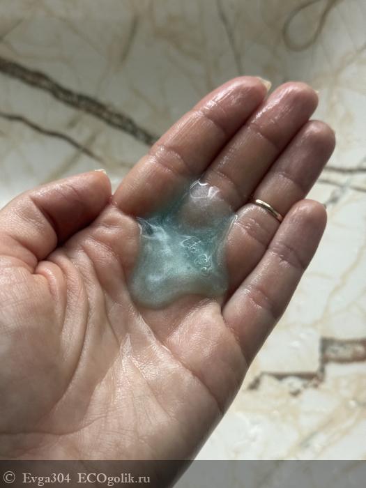 Сам шампунь — волшебного бирюзового оттенка, с легким благородным шиммером. В лучах света переливается, как морская волна. Красота, от которой даже мне радостно.