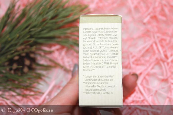 Натрия пальмат, натрия кокоат, вода, натрия оливат, глицерин, цетеариловый спирт, глицерил стеарат, калия стеарат, калия пальмитат, отдушка, апельсиновое масло, масло пачули, масло мяты колосистой, масло ферулы, натрия глюконат, натрия хлорид, натрия тиосульфат, CI 77288.