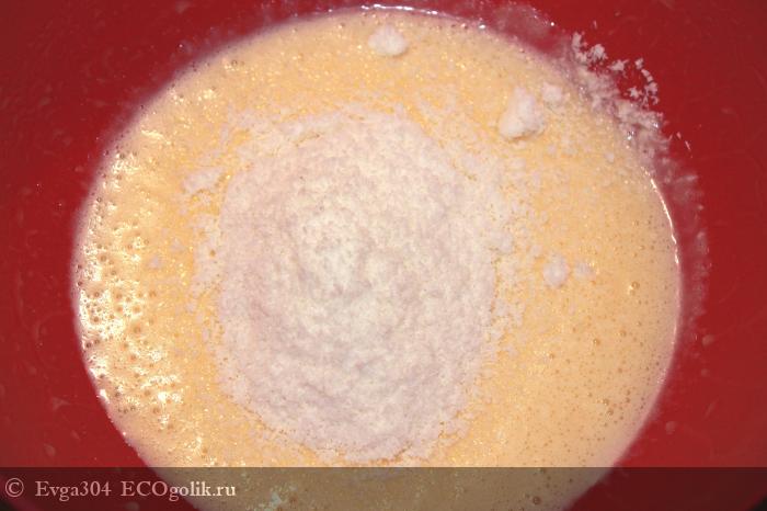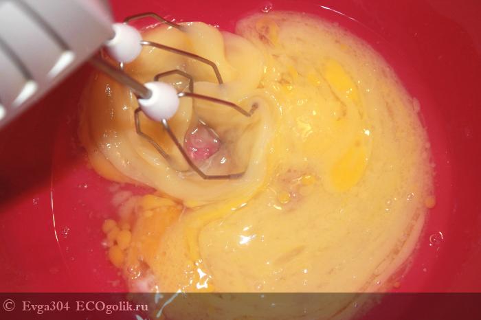 Растопить кокосовое масло, добавить сироп и взбить миксером, далее добавляем яйца.