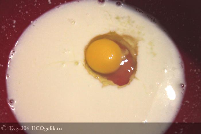 далее разбиваем яйцо и насыпаем просеянную с разрыхлителем муку.