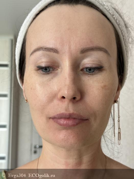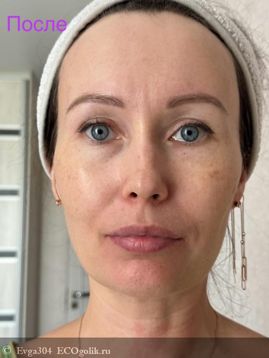 Оно заметно подтянутое, овал выражен четче за счет дренажного и лифтинг-эффекта, мимические морщинки словно стёрлись, кожа светлее, более гладкая и упругая.
