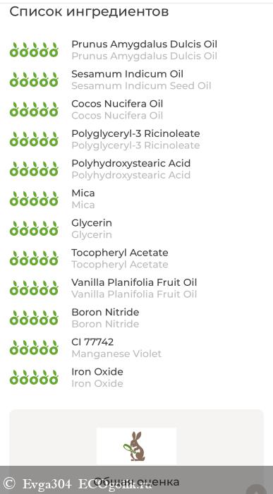 Maltooligosyl Glucoside (and) Hydrogenated Starch Hydrolysate (мальтоолигозил глюкозид (и) гидролизат гидрогенизированного крахмала), Prunus Amygdalus Dulcis (миндальной косточки) Oil, Sesamum Indicum (Sesame) Seed (кунжутное) Oil, Cocos Nucifera (Coconut) (кокоса) Oil, Polyglyceryl-3 Ricinoleate (полиглицерил-3 рицинолеат), Polyhydroxystearic Acid (полигидроксистеаровая кислота), Mica (натуральная слюда), Glycerin, Tocopheryl Acetate (витамин Е), Linoleic Acid (and) Linolenic Acid (витамин F), Vanilla Planifolia Fruit (ванили) Oil, Boron Nitride, Manganese Violet, Iron Oxide.