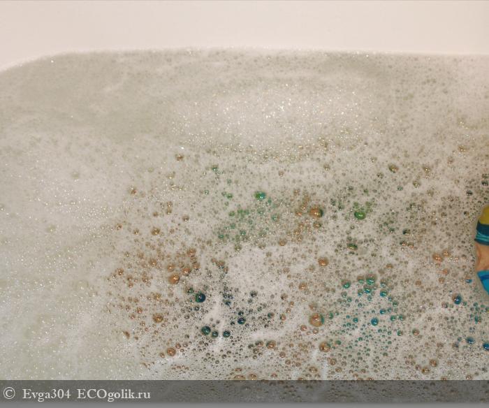 Не вся гелеобразная жидкость спешит растворяться и превращаться в пену. В воде видны нерастворенные капли.
