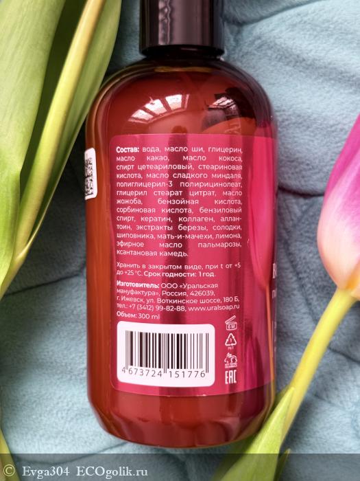 Вода, масло ши, глицерин, масло какао, масло кокоса, спирт цетеариловый, стеариновая кислота, масло сладкого миндаля, полиглицерил-3 полирицинолеат, глицерил стеарат цитрат, масло жожоба, бензойная кислота, сорбиновая кислота, бензиловый спирт, кератин, коллаген, аллантоин, экстракты березы, солодки, шиповника, мать-и-мачехи, лимона, эфирное масло пальмарозы, ксантановая камедь.
