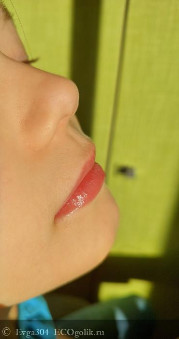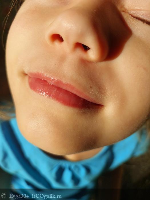 - Так как это детский блеск, то внимание моё перешло на оттенок, как он смотрится на губах, не слишком ли яркий.