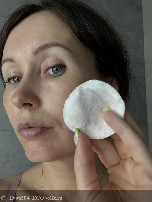 Я наношу немного мицеллярной воды на ватный диск, аккуратно прикладываю его к влажным векам на несколько секунд, а затем мягкими круговыми движениями удаляю остатки макияжа. Также протираю дискoм кожу лица для более тщательного очищения.