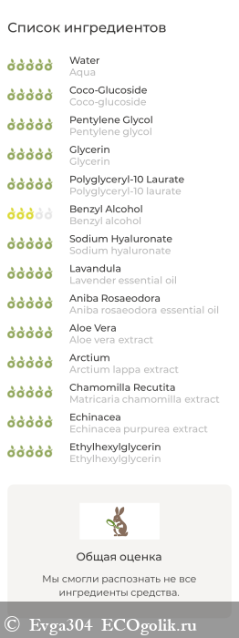 Aqua (вода дистиллированная), Lavandula angustifolia flower/leaf water (гидролат лаванды), Tilia platyphyllos flower/leaf water (гидролат липы), Aloe barbadensis leaf juice (гель алоэ вера), Coco-glucoside (кокоглюкозид), Pentylene glycol* (пентилен гликоль), Glycerin (глицерин), Polyglyceryl-10 laurate** (полиглицерил-10 лаурат), Benzyl alcohol (бензиловый спирт), Sodium hyaluronate (гиалуронат натрия), Lavender essential oil (эфирное масло лаванды), Aniba rosaeodora essential oil (эфирное масло розового дерева), Aloe vera extract (экстракт алоэ вера), Arctium lappa extract (экстракт лопуха), Matricaria chamomilla extract (экстракт ромашки), Echinacea purpurea extract (экстракт эхинацеи), Еthylhexylglycerin (этилгексилглицерин).