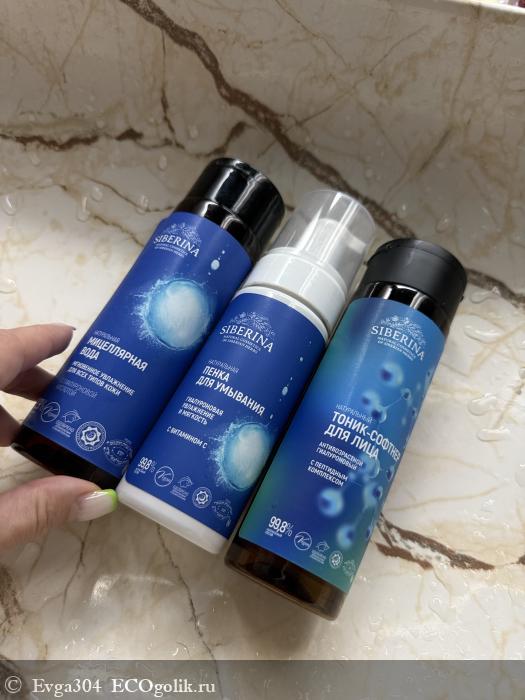 Для максимального эффекта после очищения (я еще пенкой умываю кожу лица) дополнительно наношу тоник или маска для век из той же гиалуроновой серии Siberina.
