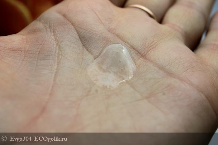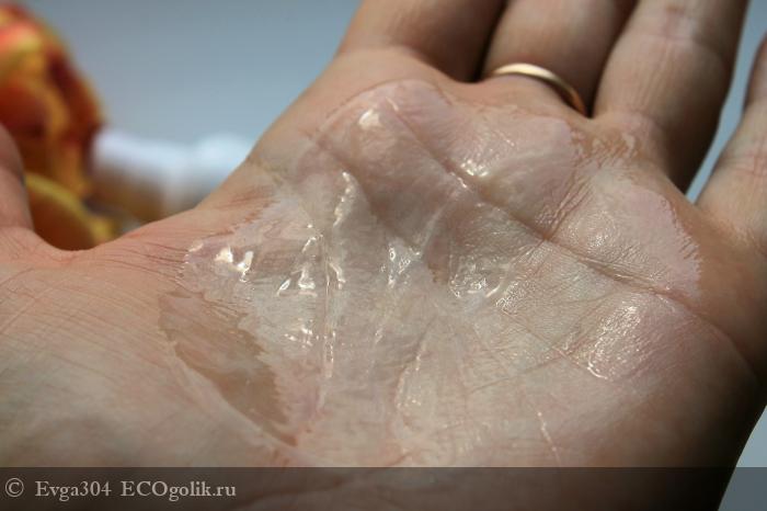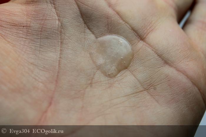 Гелевая прозрачная консистенция с перламутровым переливом, которая прям жидкая.