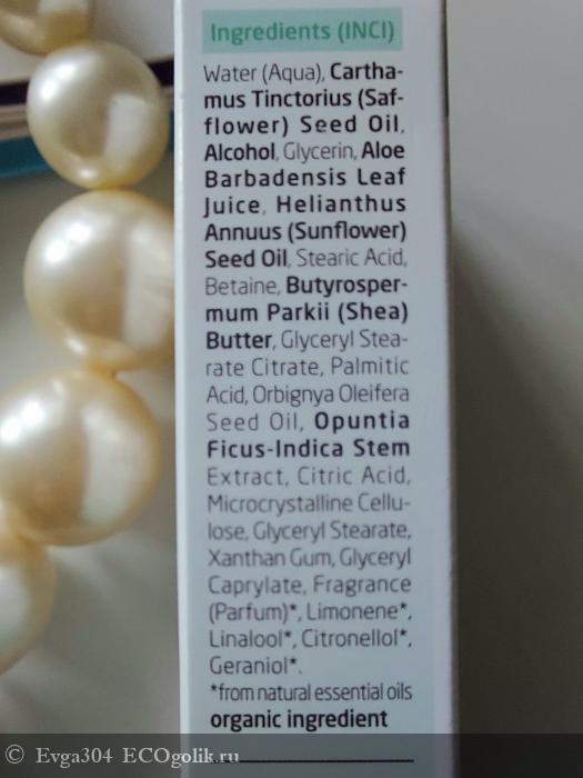 Вода, Масло сафлора, Спирт, Глицерин, Сок листьев алоэ, Масло подсолнечника, Стеариновая кислота, Бетаин, Масло ши, Глицерил стеарат цитрат, Пальмитиновая кислота, Масло камелии масличной, Экстракт стебля опунции, Лимонная кислота, Микрокристаллическая целлюлоза, Глицерил стеарат, Ксантановая камедь, Глицерил каприлат, Парфюмерная композиция* Лимонен*, Линалол*, Цитронеллол*, Гераниол*.
