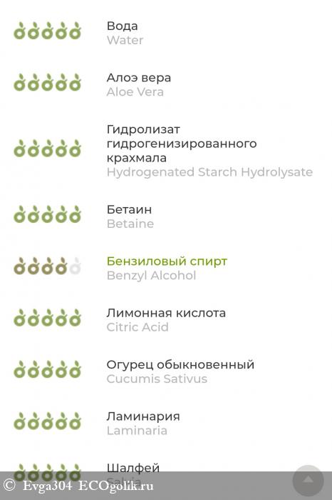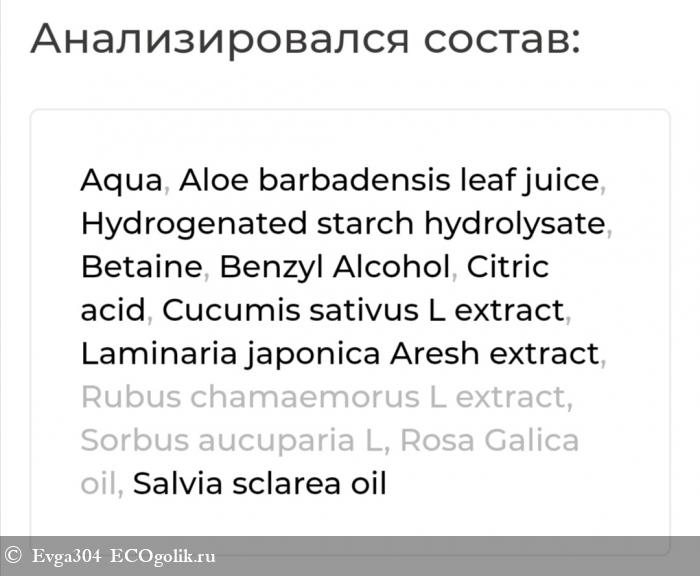 Aqua (вода родниковая), Aloe barbadensis leaf juice* (органический сок алоэ вера), Hydrogenated starch hydrolysate (растительный сорбитол), Betaine (бетаин), Benzyl Alcohol (бензиловый спирт), Citric acid (лимонная кислота), Cucumis sativus L. extract (экстракт огурца), Laminaria japonica Aresh. extract (экстракт ламинарии), Rubus chamaemorus L. extract (экстракт морошки), Sorbus aucuparia L. (экстракт рябины), Rosa Galica oil (эфирное масло розы), Salvia sclarea oil (эфирное масло шалфея мускатного).