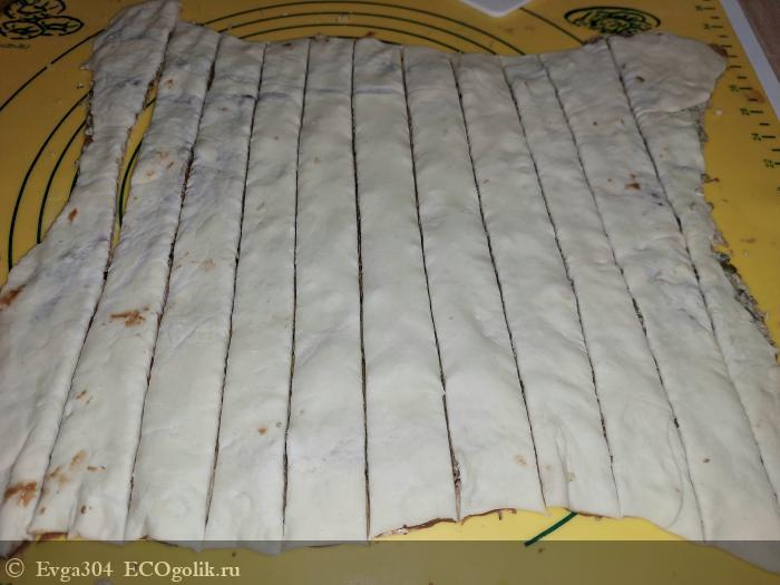 5. Далее, разрезаем тесто на полоски 1-1,5 см.