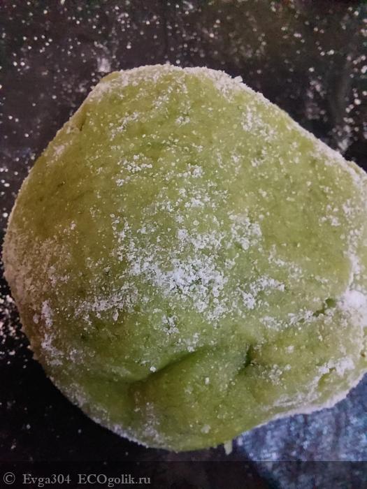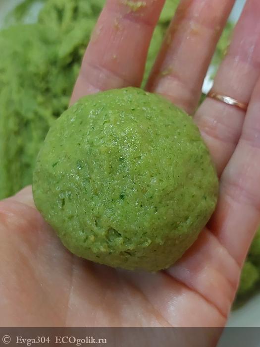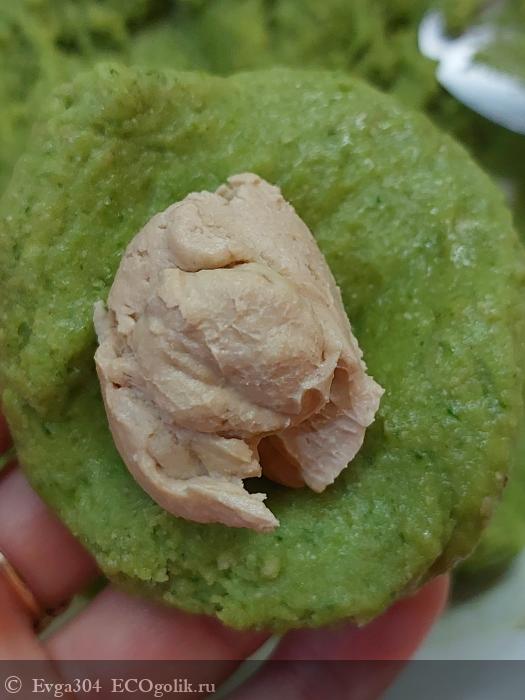 5. Спустя это время, из зелененького теста делаем лепешечки, куда кладём начинку и скатывем в шарик.