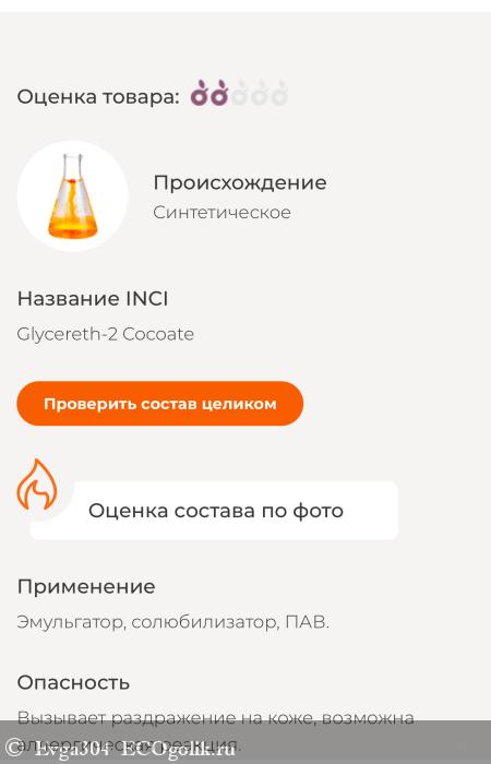 ругается на Glycereth-2 Cocoate (Растительный солюбилизатор), но опять же у меня не вызвало никакого раздражения и он тут в малых дозах. И хорошо, что он растительного происхождения. Имейте ввиду если что, если есть у вас предрасположенность к каким-либо реакциям. У меня все отлично!