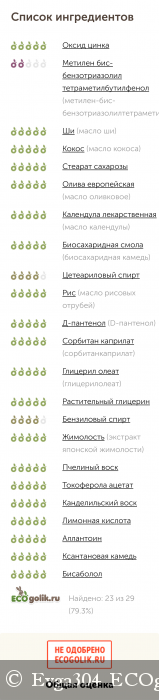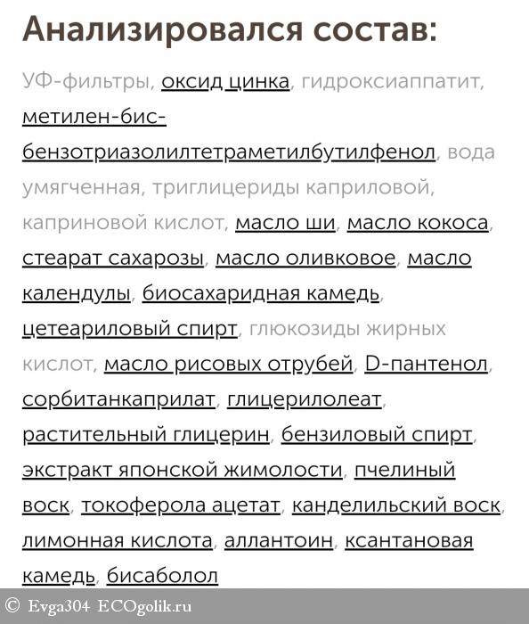 УФ-фильтры: оксид цинка (20 мас.%), гидроксиаппатит (15 мас.%) и метилен-бис-бензотриазолилтетраметилбутилфенол (MBBT), вода умягченная, триглицериды каприловой и каприновой кислот, масло ши, масло кокоса, стеарат сахарозы, масло оливковое, масло календулы, биосахаридная камедь, цетеариловый спирт, глюкозиды жирных кислот, масло рисовых отрубей, D-пантенол, сорбитанкаприлат, глицерилолеат, растительный глицерин, бензиловый спирт, экстракт японской жимолости, пчелиный воск, токоферола ацетат (витамин Е), канделильский воск, лимонная кислота, аллантоин, ксантановая камедь, бисаболол.