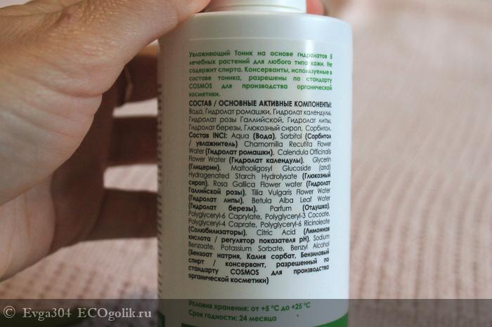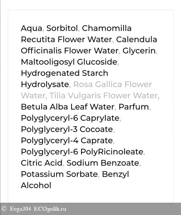 Aqua (Вода), Sorbitol (Сорбитол / увлажнитель), Chamomilla Recutita Flower Water (Гидролат ромашки), Calendula Officinalis Flower Water (Гидролат календулы), Glycerin (Глицерин), Maltooligosyl Glucoside (and) Hydrogenated Starch Hydrolysate (Глюкозный сироп), Rosa Gallica Flower Water (Гидролат Галлийской розы), Tilia Vulgaris Flower Water (Гидролат липы), Betula Alba Leaf Water (Гидролат березы), Parfum (Отдушка), Polyglyceryl-6 Caprylate, Polyglyceryl-3 Cocoate, Polyglyceryl-4 Caprate, Polyglyceryl-6 Ricinoleate (Соллюбилизаторы), Citric Acid (Лимонная кислота / регулятор показателя pH), Sodium Benzoate, Potassium Sorbate, Benzyl Alcohol (Бензоат натрия, Калия сорбат, Бензиловый спирт / консервант, разрешенный по стандарту COSMOS для производства органической косметики).