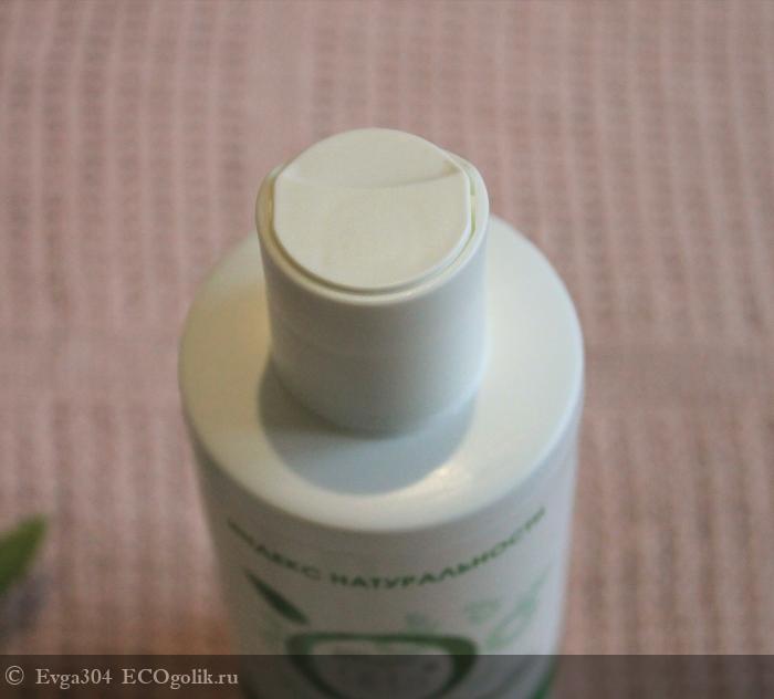Белый пластиковый флакон с зеленым оформлением в стиле линейки бренда.