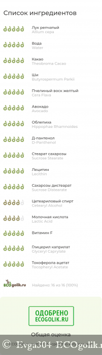 луковое масло, вода деионизированная, какао-масло, масло ши, желтый пчелиный воск, масло авокадо, алтайское облепиховое масло прямого отжима, D-пантенол, стеарат сахарозы, лецитин, дистеарат сахарозы, цетеариловый спирт, молочная кислота, комплекс природных полиненасыщенных жирных кислот (витамин F), глицерилкаприлат, токоферола ацетат (витамин Е).