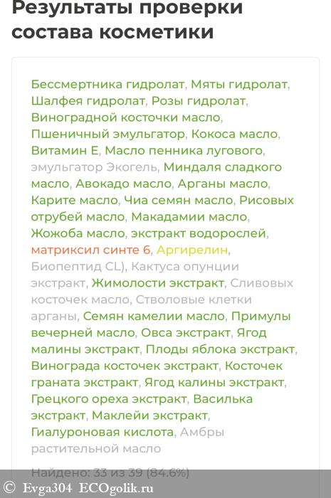 Бессмертника гидролат, Мяты гидролат, Шалфея гидролат, Розы гидролат, Виноградной косточки масло, Пшеничный эмульгатор, Кокоса масло, Витамин Е, Масло пенника лугового, эмульгатор Экогель, Миндаля сладкого масло, Авокадо масло, Арганы масло, Карите масло, Чиа семян масло, Рисовых отрубей масло, Макадамии масло, Жожоба масло, экстракт водорослей(голубой ретинол), матриксил синте 6, Аргирелин, Биопептид CL), Кактуса опунции экстракт, Жимолости экстракт, Cливовых косточек масло, Стволовые клетки арганы, Семян камелии масло, Примулы вечерней масло, Овса экстракт, Ягод малины экстракт, Плоды яблока экстракт, Винограда косточек экстракт, Косточек граната экстракт, Ягод калины экстракт, Грецкого ореха экстракт, Василька экстракт, Маклейи экстракт, Гиалуроновая кислота, Амбры растительной масло.