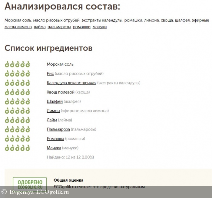 В ее состав входят только натуральные ингредиенты: морская соль, масло рисовых отрубей, экстракты календулы, ромашки, лимона, хвоща, шалфея, эфирные масла лимона, лайма, пальмарозы, ромашки, мануки.