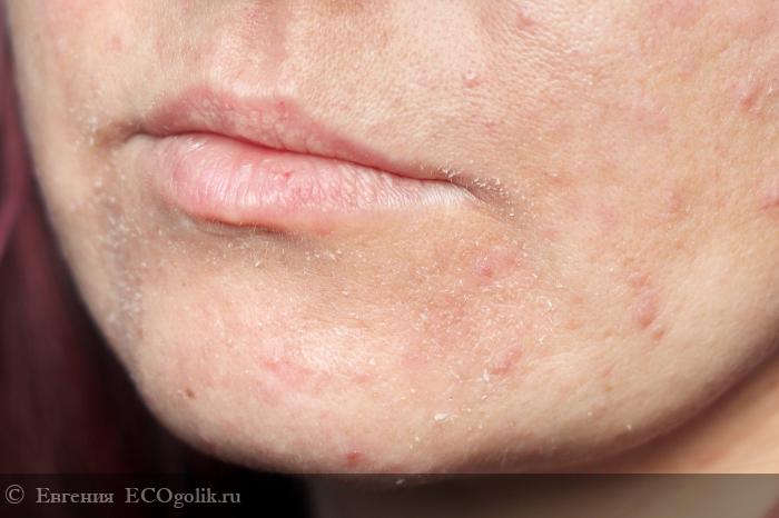 Кроме того появились участки кожи с сильными шелушениями. То, что на фото ниже - это еще ерунда, было и хуже, когда в конце дня на работе видела на подбородке целые пласты шелушащейся кожи, постоянно смазывала её заживляющим кремом, чтобы как-то пригладить белесую бороду.
