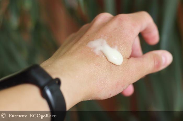 Текстуру отлично видно по фотографии ниже: состав начинает подтаивать от тепла кожи, разносится по коде очень легко, т.к. он сохранил водянистость, присущую гелю Алоэ.