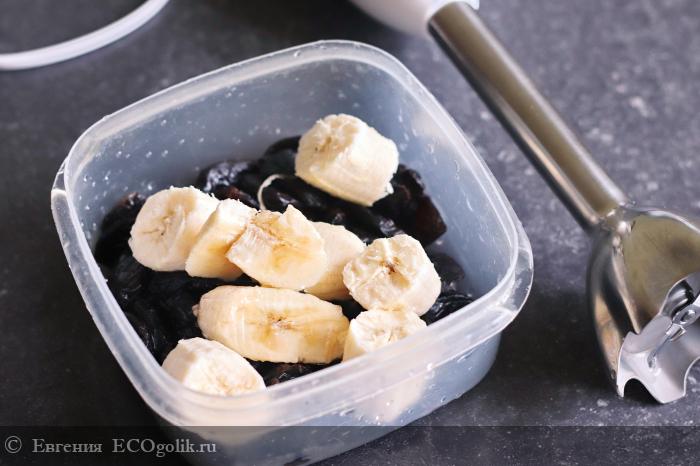 соединяем вместе чернослив, банан и сироп и хорошенько размалываем блендером до однородности