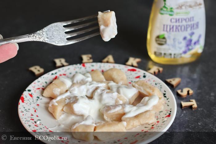 Подавать вареники можно с разными добавками. Дочка у меня не любит сметану, потому я добавляю сливочное масло и сироп цикория