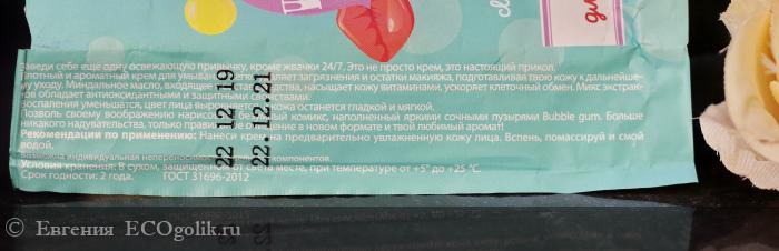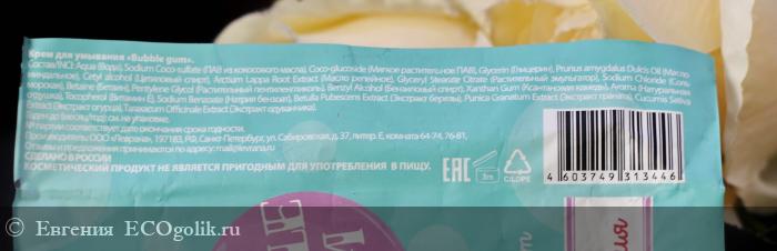 Я разобрала состав на сервисе Экоголика, все компоненты состава были найдены, однако из-за наличия отдушки неизвестного происхождения состав не был одобрен. Учитывая то, что запах у крема для умывания "Бабл гам", то есть жвачка, тут даже уточнять смысла нет - отдушка синтетического происхождения, это не смесь эфирных масел. Есть в этом минус - состав не на 100% экологичный, однако... ни одно эфирное масло не даст такой вкусной отдушки