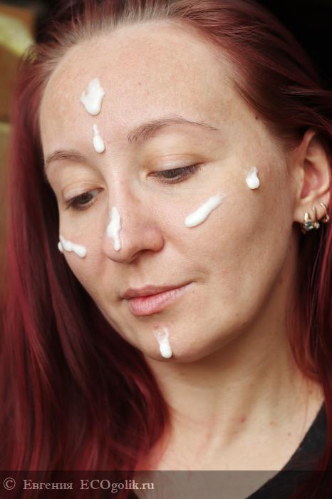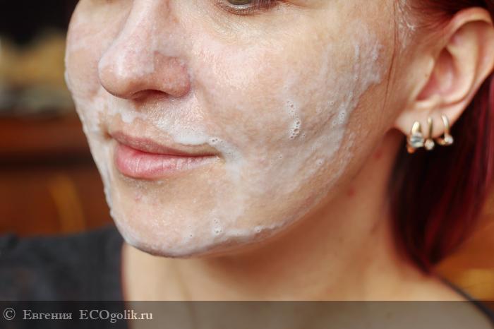 Крем распределяется по коже ровным слоем, пену руками взбить, как ни старалась, у меня не получалось. Выходила просто какая-то белесая эмульсия, и всё. Однако вопросов: "А точно ли я всё промыла, а точно ли очистила кожу", в принципе, не возникает. Вижу, что средство распределено равномерно, чуть массирую, выдерживаю секунд 10-15 и смываю.