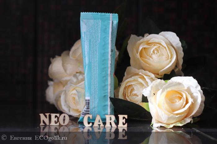 Упаковки серии NEO CARE необычны тем, что запакованы в пакетики, кажется, будто внутри скрывается какая-то сладость. На обороте обещания от использования крема, состав, способ применения: