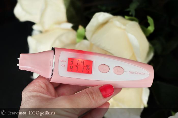 Итак, я под дня пробегала по делам, что и показал мой прибор: жирность кожи повышена (47,1%), увлажнённость низкая (31,4). Прибор об этом сигнализирует красным цветом и грустным смайликом