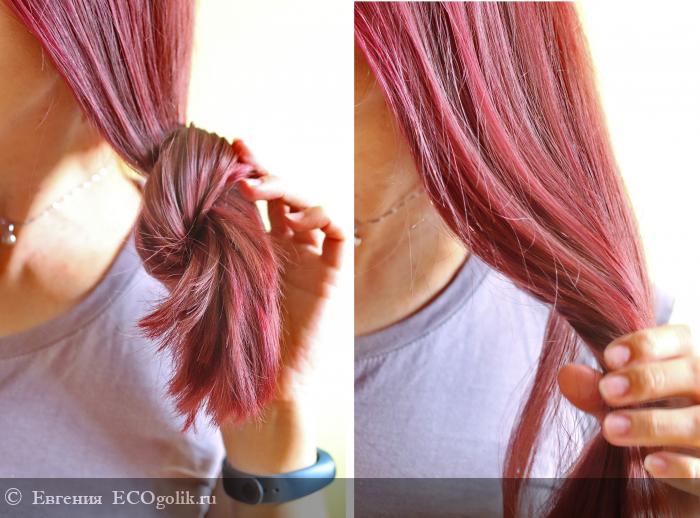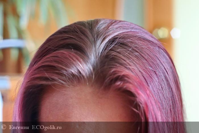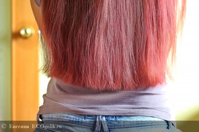 В первую очередь же промываем кожу головы, макушку, ну, по крайней мере так делаю я, длину же промываю пеной, стекающей с макушки. Так что макушка берет на себя главный удар)) Если шампунь жёсткий, то появляется куча антеннок, мелкие волоски начинают торчать едва ли не вертикально. Тут же видно, что волосок лежит к волоску... разве что корни немного отросли и родной холодный русый начал проглядываться из-под красного.