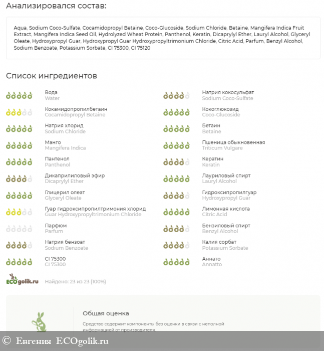 Обращу внимание лишь на то, что отдушка в шампуне неизвестного происхождения, именно из-за неё эко-сервис при проверке не смог рекомендовать шампунь к применению. К сожалению, на официальной страничке производитель не уточняет натурального или синтетического происхождения отдушка, так что каждый сам должен принимать для себя решение считать ли этот шампунь
