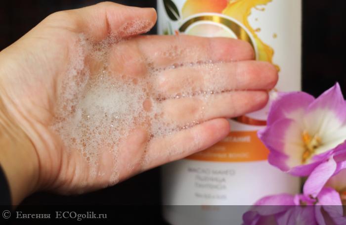 Запах: могу сказать с уверенностью, что вся линейка с манго им удалась. Вкуснейший запах натурального спелого манго, я нюхаю шампунь и просто ощущаю во рту волокнистую текстуру этого сочного спелого фрукта. Вкусно. ВКУСНО! Очень вкусно! Запах при этом не чрезмерный, мне даже хотелось бы, чтобы отдушка была посильнее. Да, он вкусно пахнет при использовании, но после смывания с волос уже не ощутим, от волос после мытья шампунем не пахнет. Хотя, может, это и плюс, именно поэтому в итоге стали мыть волосы этим шампунем все, даже мужчина не сопротивляется - говорит, что запах вкусный и не приставучий. Один на один ему ничего не мешает пахнуть фруктиками, а вот вне ванны уже никто не заподозрит его в этом пристрастии 😎