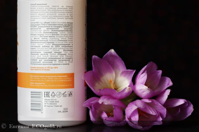 INCI: Aqua (Вода), Sodium Coco-Sulfate (Натрия кокосульфат / ПАВ из кокосового масла, сертификат ECOSERT, разрешенный по стандарту COSMOS для производства органической косметики), Cocamidopropyl Betaine (Кокамидопропилбетаин), Coco-Glucoside (Кокоглюкозид), Sodium Chloride (Натрия хлорид), Betaine (Бетаин), Mangifera Indica Fruit Extract (Экстракт манго), Mangifera Indica Seed Oil (Масло манго), Hydrolyzed Wheat Protein (Протеины пшеницы), Panthenol (Пантенол), Keratin (Биомиметический кератин), Dicaprylyl Ether (Дикаприлиловый эфир), Lauryl Alcohol (Лауриловый спирт), Glyceryl Oleate (Глицерил олеат), Hydroxypropyl Guar (and) Hydroxypropyl Guar Hydroxypropyltrimonium Chloride (Катионные производные гуаровой камеди), Citric Acid (Лимонная кислота), Parfum (Отдушка), Benzyl Alcohol (and) Sodium Benzoate (and) Potassium Sorbate (Консервант, разрешённый по стандарту COSMOS для производства органической и натуральной косметики), CI 75300, CI 75120 (Натуральные красители куркумин и аннато)