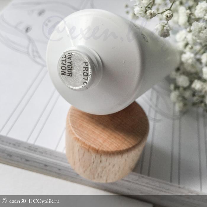 Как и многие флакончики марки, лосьон упакован в пластиковую тубу белого цвета с деревянной крышкой, да, да, она именно деревянная, и если у геля-шампуня она быстро отвалилась, то у лосьона дожила до самого конца в эстетическом виде