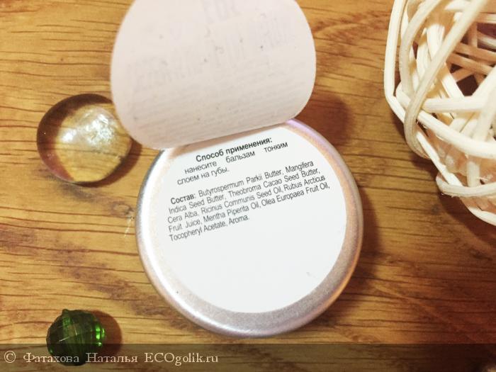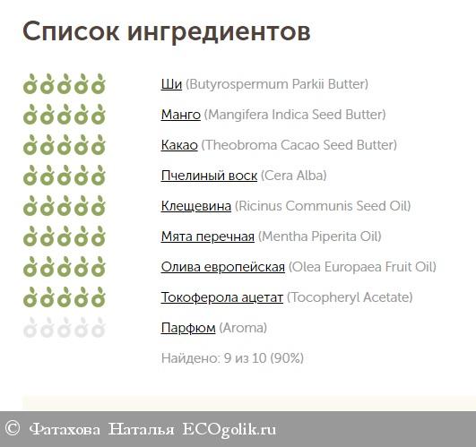 Состав : Butyrospermum Parkii Butter, Mangifera Indica Seed Butter, Theobroma Cacao Seed Butter, Cera Alba, Ricinus Communis Seed Oil, Rubus Arcticus Fruit Juice, Mentha Piperita Oil, Olea Europaea Fruit Oil, Tocopheryl Acetate, Aroma.