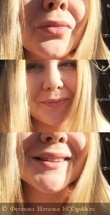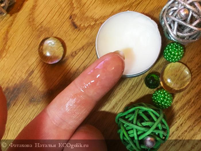 По консистенции бальзам твердый, при холодных температурах. Чем теплее в помещении тем податливее бальзам. Наносится на губы легко, распределяется тоже. Его можно назвать «жирненьким». Имеет отличный блеск, отлично борется с мелкими трещинами и обветриваниями. Единственное, может быть кому-то будет неудобно наносить бальзам пальцами. Можно использовать кисть. Конечно, я соглашусь, негигиенично наносить бальзам грязными руками. Было бы неплохо, если бы производитель предусмотрел форму губной помады.