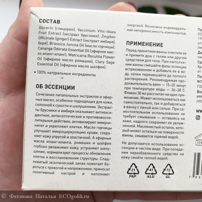Хочу отметить, что данный вид ухода очень подходит для холодного времени года. Моя кожа начинает шелушиться от холода и вот эссенция отлично справляется с данной проблемой. Напитывает кожу влагой и полезными веществами. Я всегда следую этапам: ванна с водой и эссенцией , полежала, помылась с гелем, вытерлась полотенцем. Восхитительный результат на коже - она супер бархатистая и нежная. Без сухости и раздражений. И эмоциональное состояние , конечно, радует. Полностью расслабляешься. При таком способе применения полотенце не остается маслянистым. На ванной остается небольшой слой налета, который с легкостью удаляется обычным чистящим средством. Но на это и производитель указывает. 1 флакончик на 1 применение, то есть упаковки средства хватит на 3 принятия ванны.
