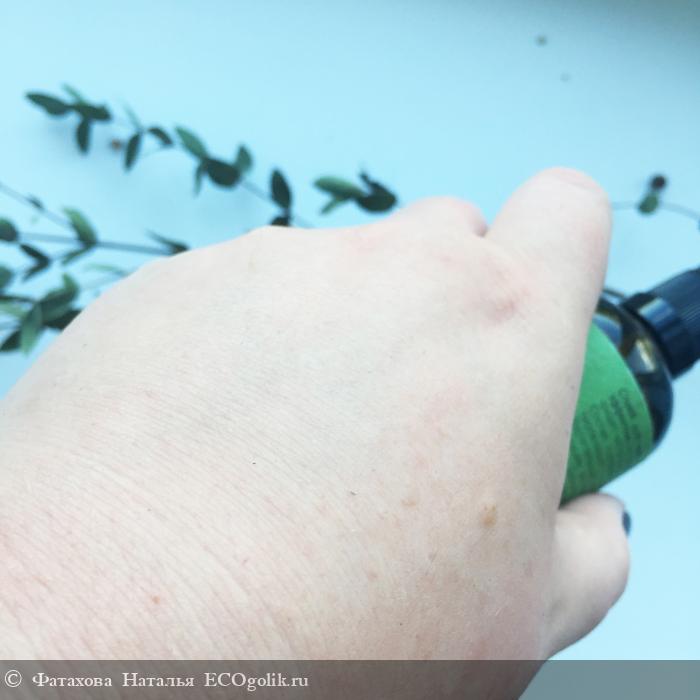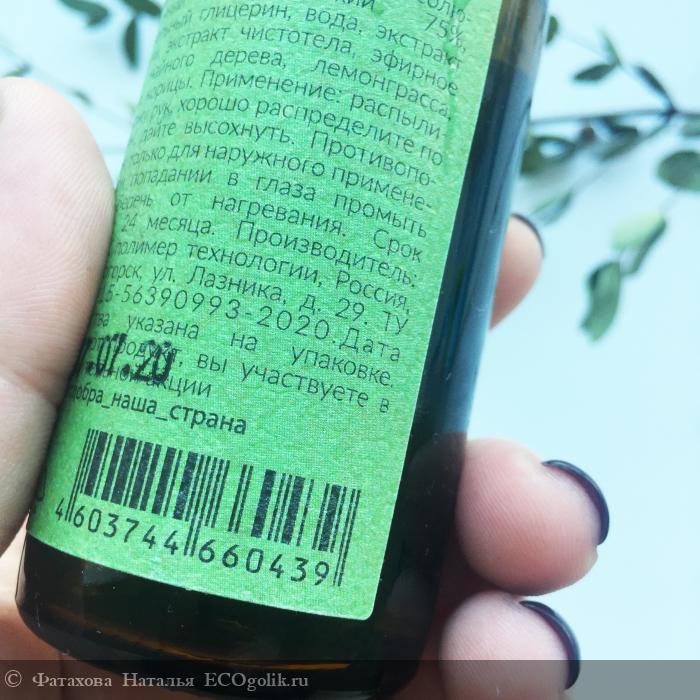 Подведем итог. Распыление у средства хорошее, очень легко и быстро испаряется с поверхности кожи, при этом оставляет легкую, едва ощутимую защитную пленочку. Запах яркий, все оттенки цитрусов, спирта и чайного дерева. Он быстро проходит, и остается древесный аромат. Липкости после использования нет, также как и сухости. Это отличное, достойное средство - антисептик в рядах натуральной косметики.