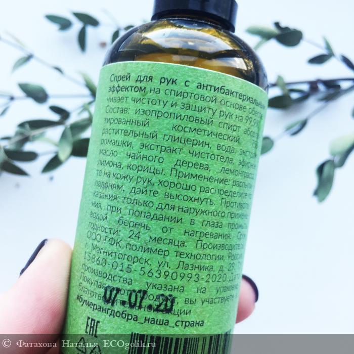 Спрей создан на спиртовой основе. И снова скажу правду! В нашей недавней ситуации было не до натуральности. Работая в большой компании, где все трогают дверные ручки, я пользовалась чистым медицинским спиртом, чтобы защитить себя и свою семью. Натуральность этого спрея 30% - так указывает производитель. И мне этого достаточно. Состав данного спрея в тысячу раз лучше любых аптечных антисептиков. И меня это устраивает.