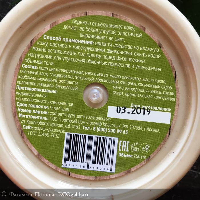 Упакован в пластиковую прозрачную баночку с откручивающейся крышечкой. Под крышкой при первом открывании найдете защитную фольгированную мембрану, очень актуально для данного средства по его консистенции, защищает от вытекания. Этикетка очень яркая, вкусная, сочная. Сразу ассоциации с летом, счастьем. Объем данного скраба 150 мл. Производитель указывает о том, что средство на 100% натурально и не тестируется на животных. Срок годности 9 месяцев с даты изготовления, которую легко найти на оборотной стороне баночки, после открытия срок годности снижается до 6 месяцев. Стоимость приятная - 329 рублей.