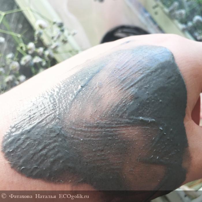Консистенция у маски кремовая с мельчайшими вкраплениями (вероятно, сильно измельченный цеолит), на фото выше их отлично видно (на сером глянцевом фоне есть мелкие черные точки). И на коже частички тоже ощущаются. Похожа на блестящий свежеприготовленный крем для тортика. Очень легко распределяется, скользит.
