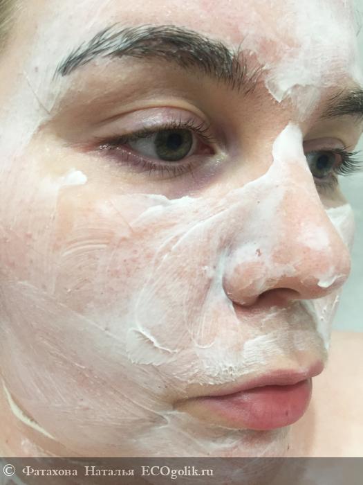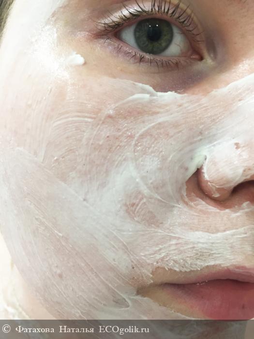 На очищенную кожу лица нанести маску. Я наношу достаточно плотным слоем, вот именно с данной маской мне хочется слой потолще. Во время использования маска впитывается в кожу, там где есть сухие участки впитывание происходит активнее. Для снятия маски можно использовать спонж, а можно и просто ладошками смыть. Любой способ хорош.