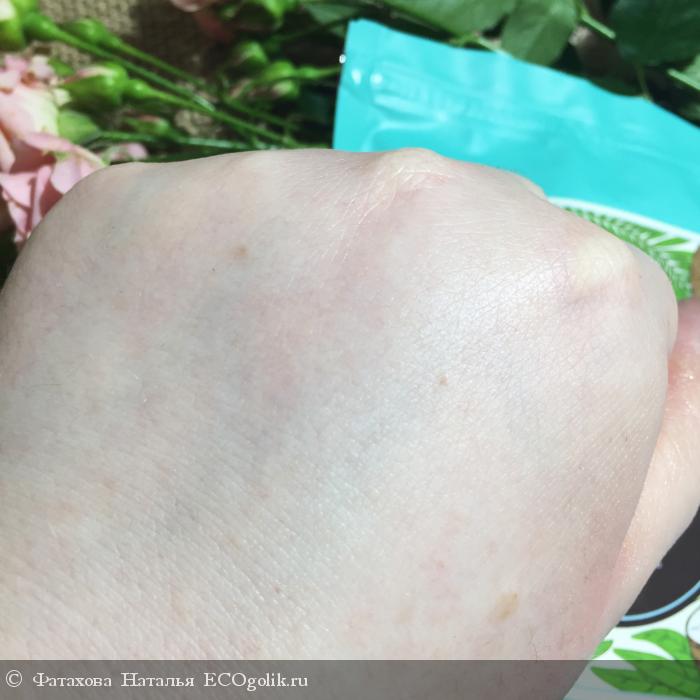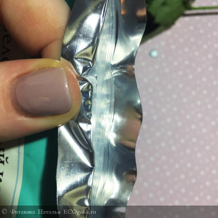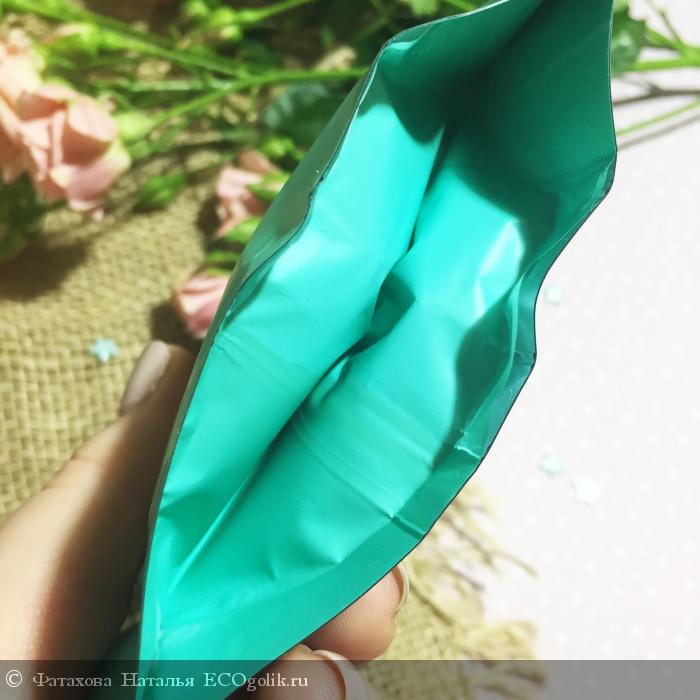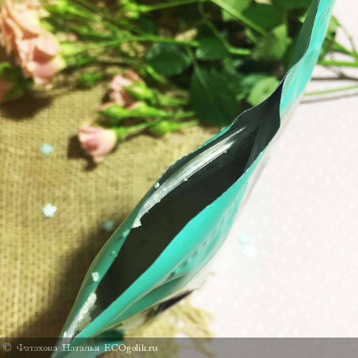 Упакован скраб в фольгированный пакетик с внешней стороны залитый приятным мятно-голубым цветом. Внутри пакета застежка зип лок, удобненько. Впервые у меня скраб в такой упаковке, не вижу недостатков.