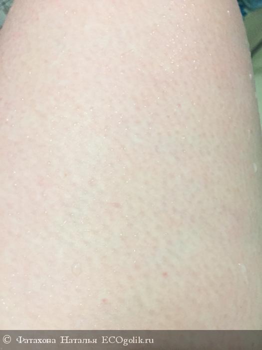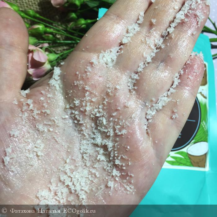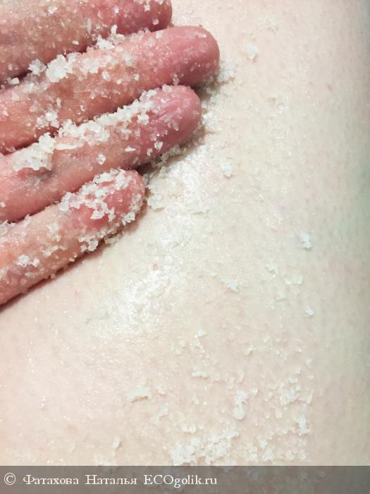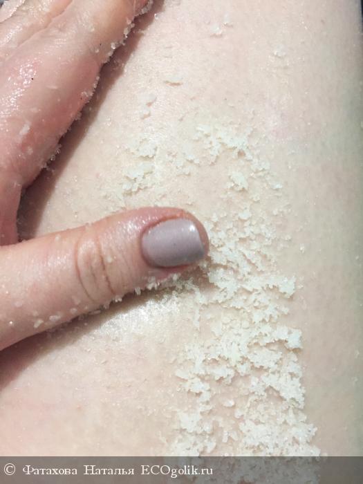 Я наносила скраб руками и начинала массаж руками. Скраб слегка осыпается с кожи, но совсем немного. Поскольку скраб достаточно жестко скрабирует, щетку я применять для своей кожи не рискнула, а вот рукавичкой кесе с удовольствием помассировала тело. При массажа рукавицей масло легко впитывается в кожу. Не подумайте, что от рукавицы слабый скрабирующий эффект. Совсем нет. Для того, чтобы кожа покраснела - достаточно! Мне даже было больновато местами. Кстати, если у вас кожа где-то повреждена или есть высыпания - лучше не используйте, как и для чувствительной тонкой кожи вряд ли подойдет. До красноты я себя растерла, подождала и начала смывать теплой водой. Эффекта супер маслянистости не было, потому что масло впиталось в кожу. После скраба можно не использовать моющих средств, а можно и использовать, как вам нравится. Кожа после использования просто шелковая, нежнейшая, ароматно пахнущая кокосом. Ее приятно гладить, короче я просто получила нереальнейшее наслаждение. От аромата, от результата, от осознания полной натуральности состава. Также пришло осознание того, что скраб даже 200 рублей не стоит и тут я поняла, что это еще и отличное бюджетное средство, при использовании которого 1 раз в неделю хватит ооочень надолго. Плюс он не тестируется на животных.