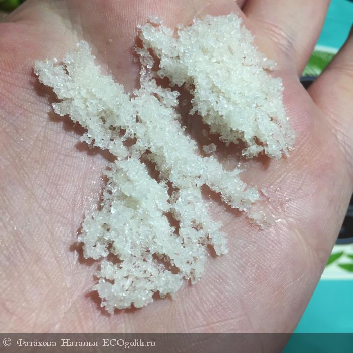 Не нужно применять анализатор, чтобы увидеть натуральность данного скраба. Всего лишь четыре всем понятных компонента, без красителей, ароматизаторов и прочих нехороших компонентов. В качестве скрабирующих компонентов выступают соль, сахар и стружка кокоса, которые справляются с отшелушиванием омертвевших частичек просто на ура. Кто любит скрабы пожестче - это точно ваш вариантик. В свою очередь масло кокоса также выполняет свою функцию и во время скрабирования отлично питает кожу, как раз в то время, когда кожа лучше всего воспринимает косметические средства. Кокос также полезен для регенерации клеток кожи. Состав отличный.