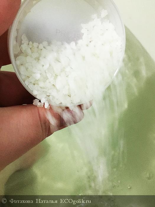 Рекомендуют на применение использовать 3-4 столовые ложки соли на весь объем ванны. Я так и сделала, запах окутал всю ванну, находится в ней было более некомфортно. Это совсем не фруктовый аромат и не цитрусовый, и даже на бергамот не похоже. После начала добавлять одну крышечку на весь объем ванны. Одно напишу, принимать ванну с морской солью нужно не менее 20 минут для осуществления обменных процессов.
